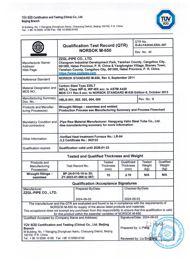 公司已通过挪威国家石油标准NORSOK M-650 ASTM A420 WPL6认证。