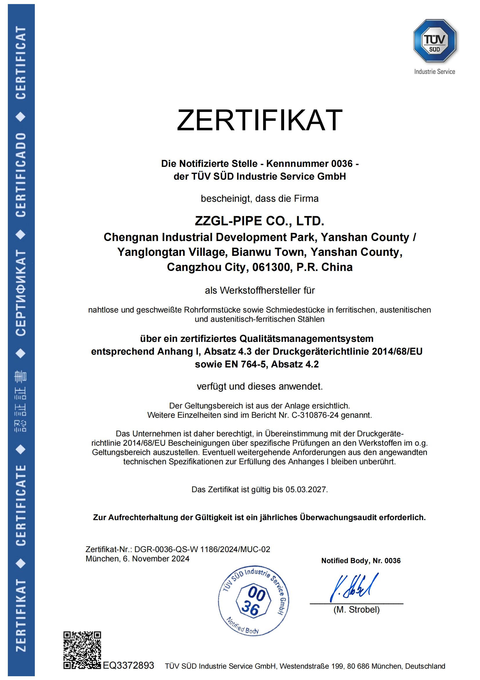 根据TUV作为WP11材料制造商的审核范围,符合PED 2014/68/EU Annex l, Section 4.3:资质认证详看下方认证证书