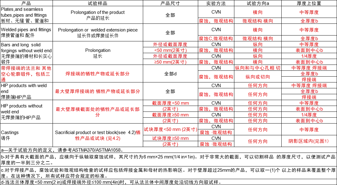 The test samples shall be made from a sacrificial product or from a prolongation/extension of a product in  the final solution annealed condition with locations of test specimens as defined in Table 1 representing the thickest  product  within  the  lot.Alternatively,a  representative  test  block  may  be  used  when  agreed  with  the purchaser.